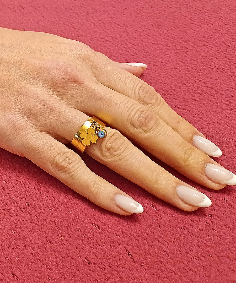 Δαχτυλίδι ρυθμιζόμενο ατσάλι κίτρινο χρυσό επιχρύσωμα τριφύλλι με μπλε μάτι. Αποκτήστε το δικό σας σήμερα και αναδείξτε το στυλ και την προσωπικότητά σας με αυτό το μοναδικό δαχτυλίδι.