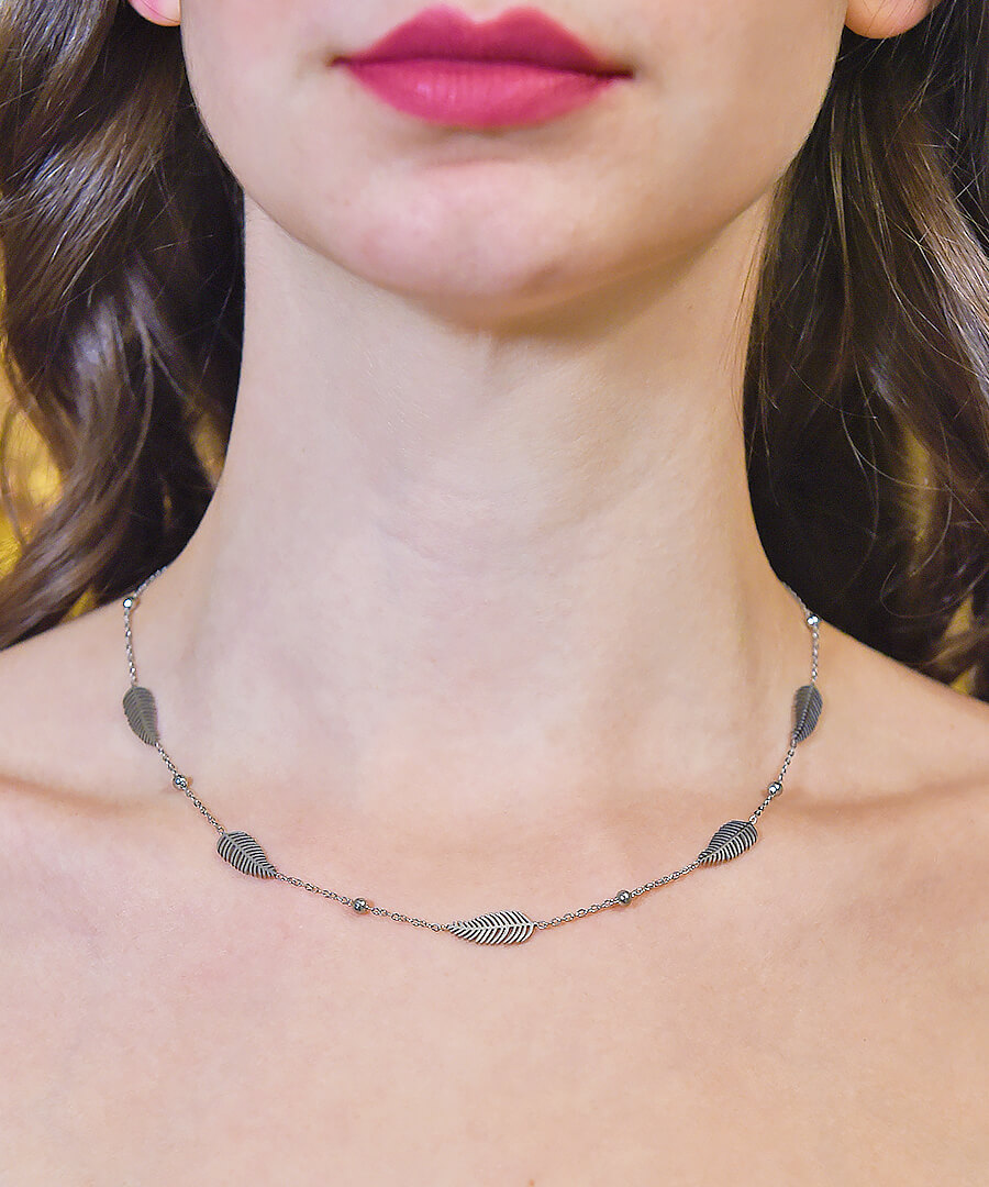 Κολιέ από ατσάλι με ασημί φύλλα. Το κούμπωμα είναι ρυθμιζόμενο. Για να είστε all day και all night in fashion.