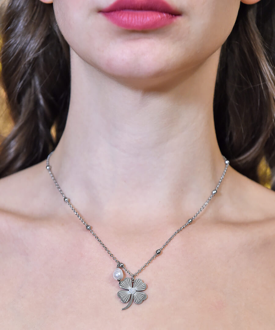 Κολιέ από ατσάλι ασημί τριφύλλι με πέρλα. Το κούμπωμα είναι ρυθμιζόμενο. Για να είστε all day και all night in fashion.