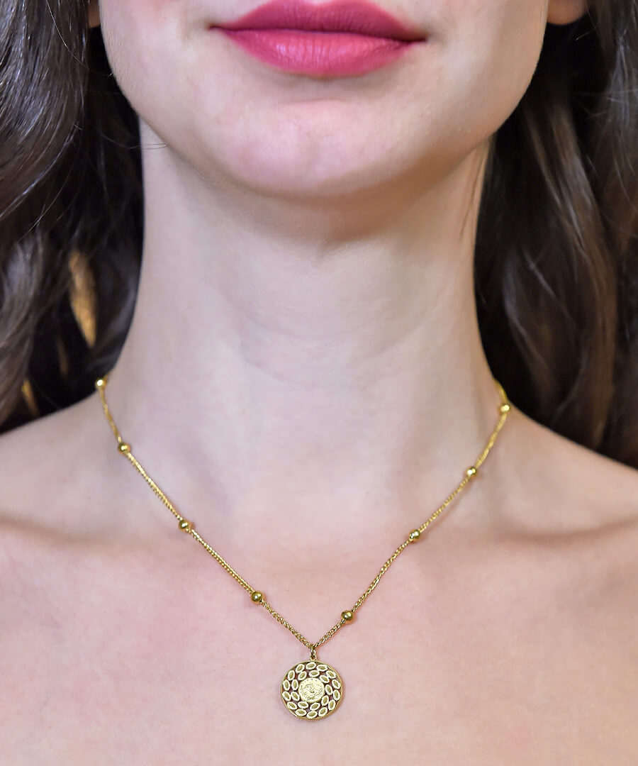 Κολιέ από ατσάλι με κίτρινο επιχρύσωμα σχέδιο ήλιος. Το κούμπωμα είναι ρυθμιζόμενο. Ένα πρωτότυπο κολιέ που μαγνητίζει τα βλέμματα από την πρώτη κι όλας στιγμή.