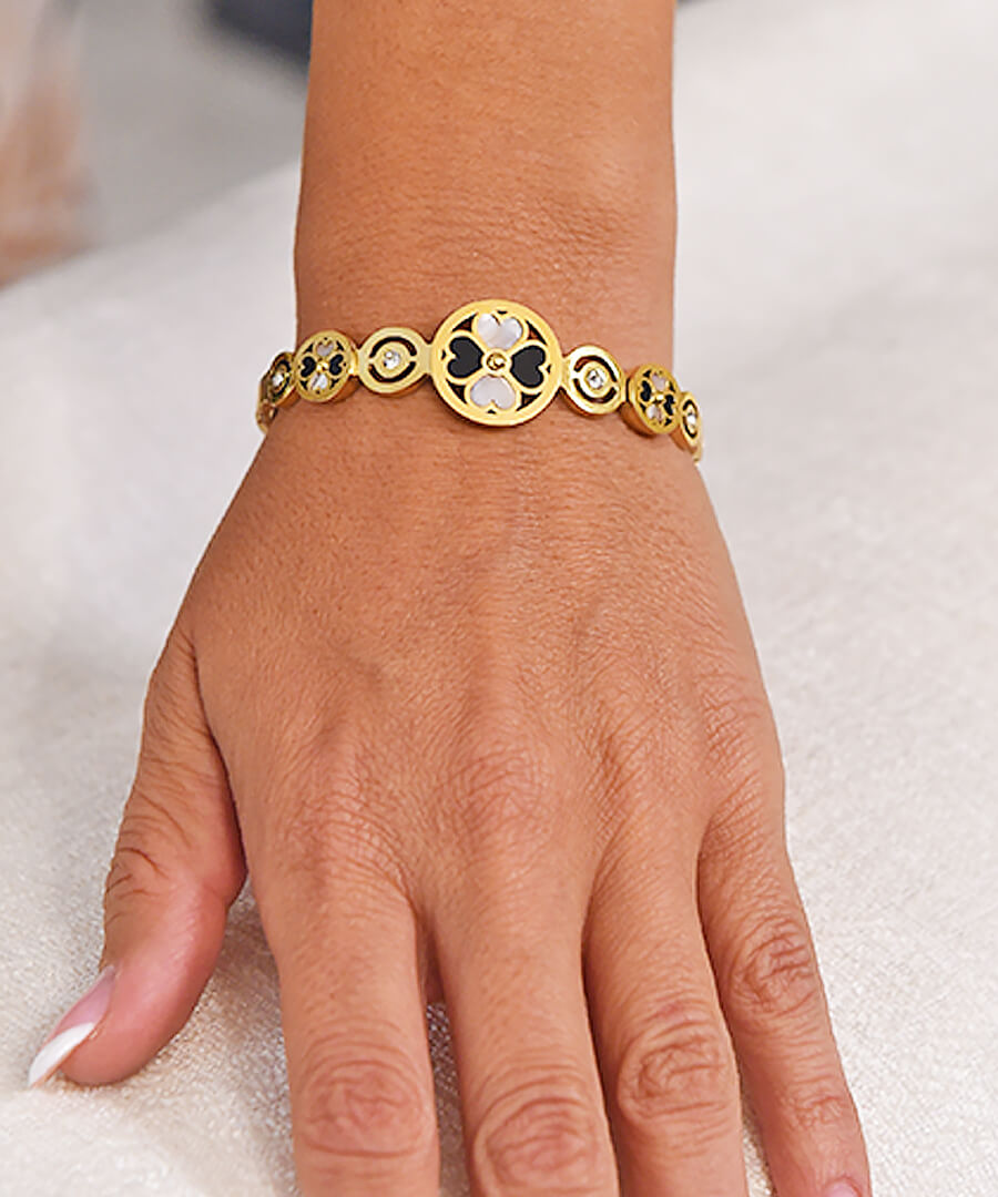 Βραχιόλι μπρασελέ από ατσάλι με κίτρινο επιχρύσωμα αλυσίδα κύκλοι με ασπρόμαυρες καρδιές. Προσθέστε λάμψη στο στυλ σας. Ιδανικό για να εκφράσετε την αγάπη σας προς αγαπημένα πρόσωπα. Κάντε την ημέρα τους ξεχωριστή με αυτό το εντυπωσιακό δώρο.