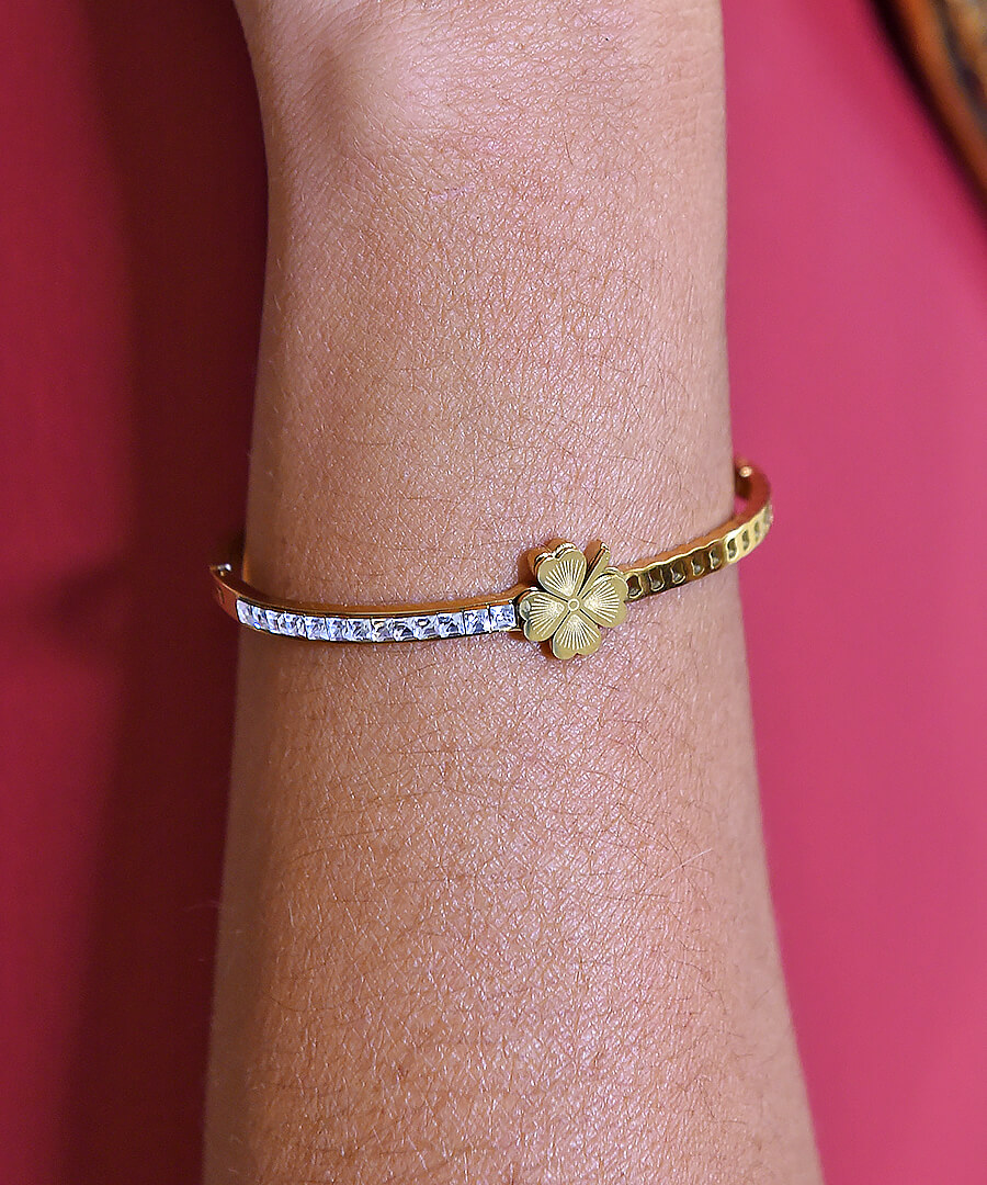 Βραχιόλι μπρασελέ ατσάλι κίτρινο επιχρύσωμα τριφύλλι ημικύκλιο με λευκές πέτρες